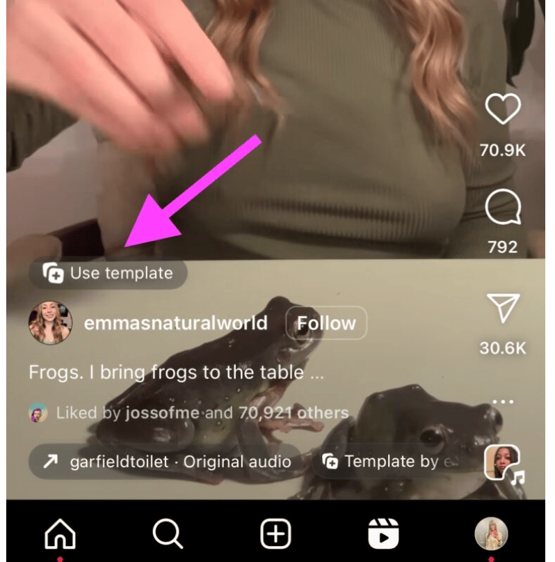 Scroll through the Reels Feed and soon enough, you’ll see a Reel with the words ‘Use Template’ in the bottom left-hand corner.